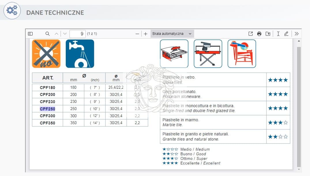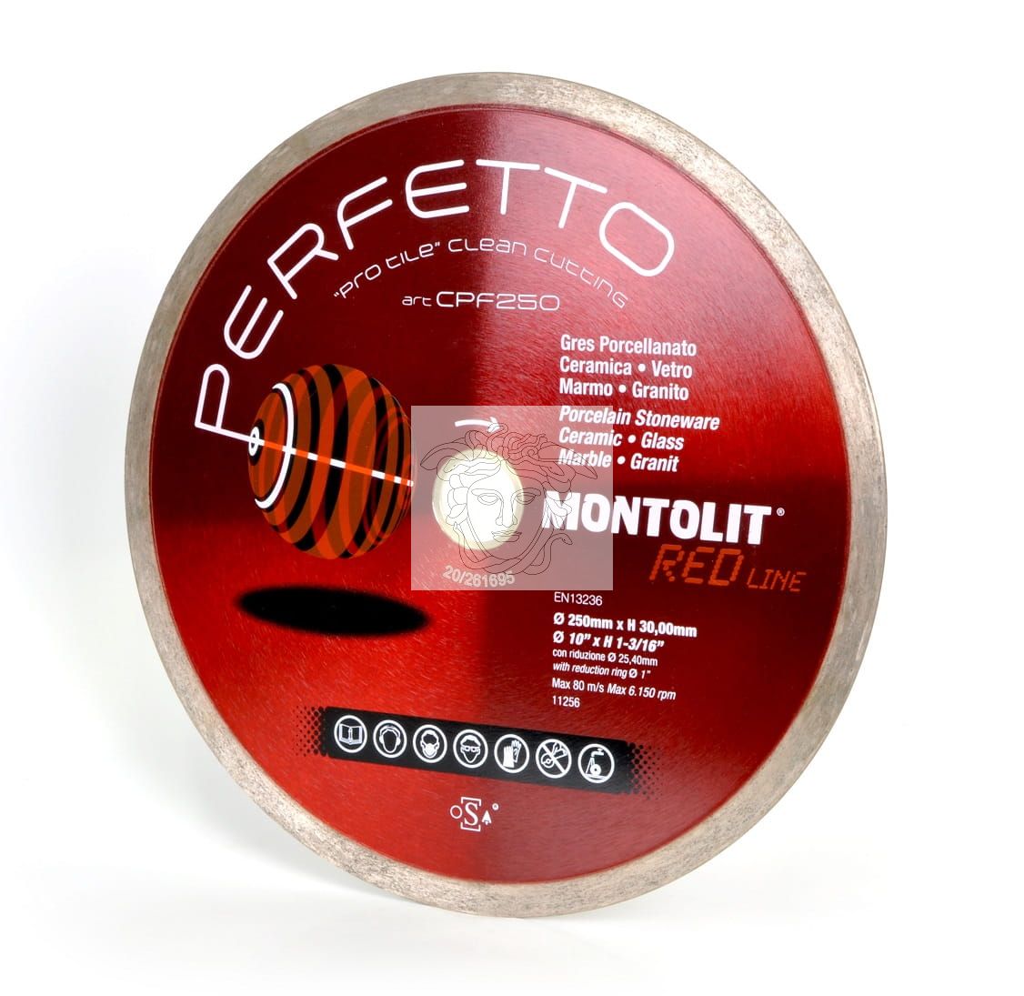 Tarcza diamentowa Montolit CPF250 PERFFETO RED Line na mokro idealna dla trudnych materiałów ceramicznych gresowych porcelanowych spiekanych w jednym lub dwóch procesach w podwyższonej temperaturze, szklanych lub kamiennych i gładkiego wykończenia tam, gdzie wymagane jest doskonałe wykończenie cięcia.