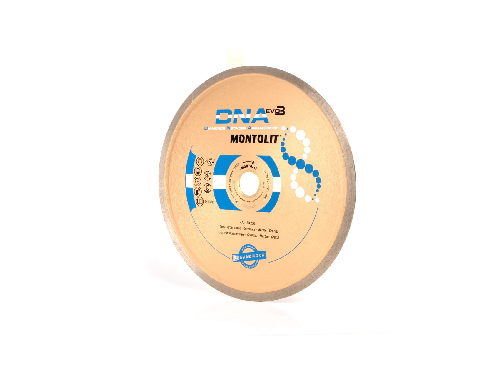 Tarcza diamentowa Montolit CX250 z technologią DNA na mokro idealna dla trudnych materiałów ceramicznych gresowych porcelanowych spiekanych w jednym lub dwóch procesach w podwyższonej temperaturze, szklanych lub kamiennych i gładkiego wykończenia tam, gdzie wymagane jest doskonałe wykończenie cięcia.