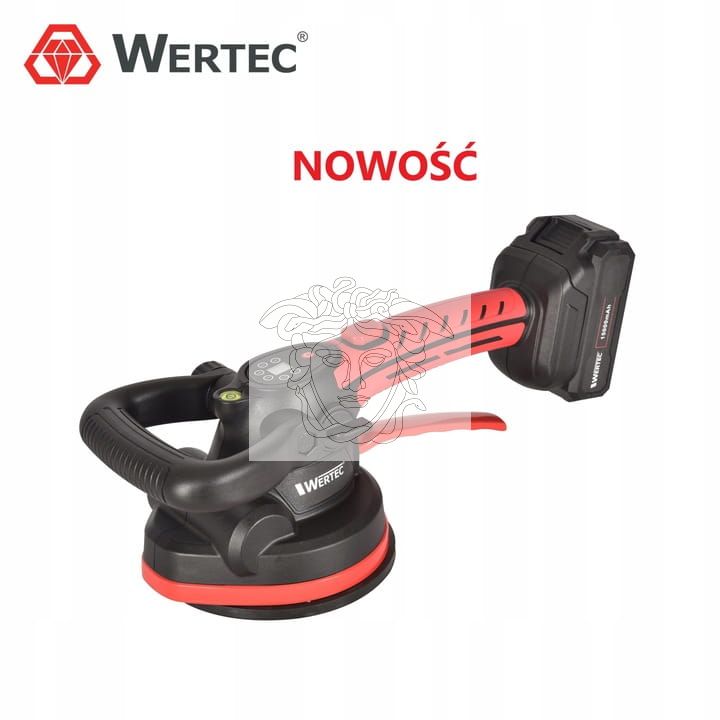 Przyssawka do płytek Wertec zasilana jest baterią litową o napięciu 16.8 V i pojemności 2000 mah. Jej naładowanie do pełna za pomocą dołączonej ładowarki trwa 2h. W zestawie z przyssawką do płytek Wertec znajdują się dwie baterie.